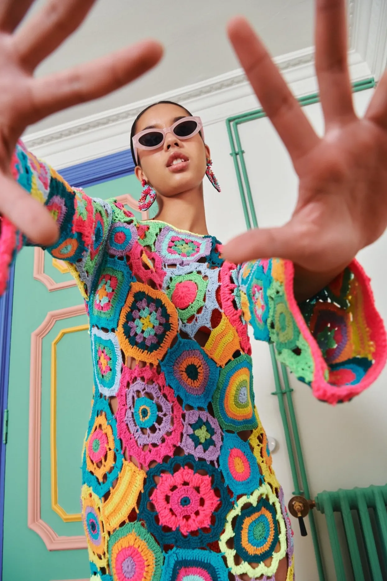Step Into A New Season With Our Open Crochet Midi Dress Featuring Long Sleeves And An Open Back Adorned With Neon Beading.