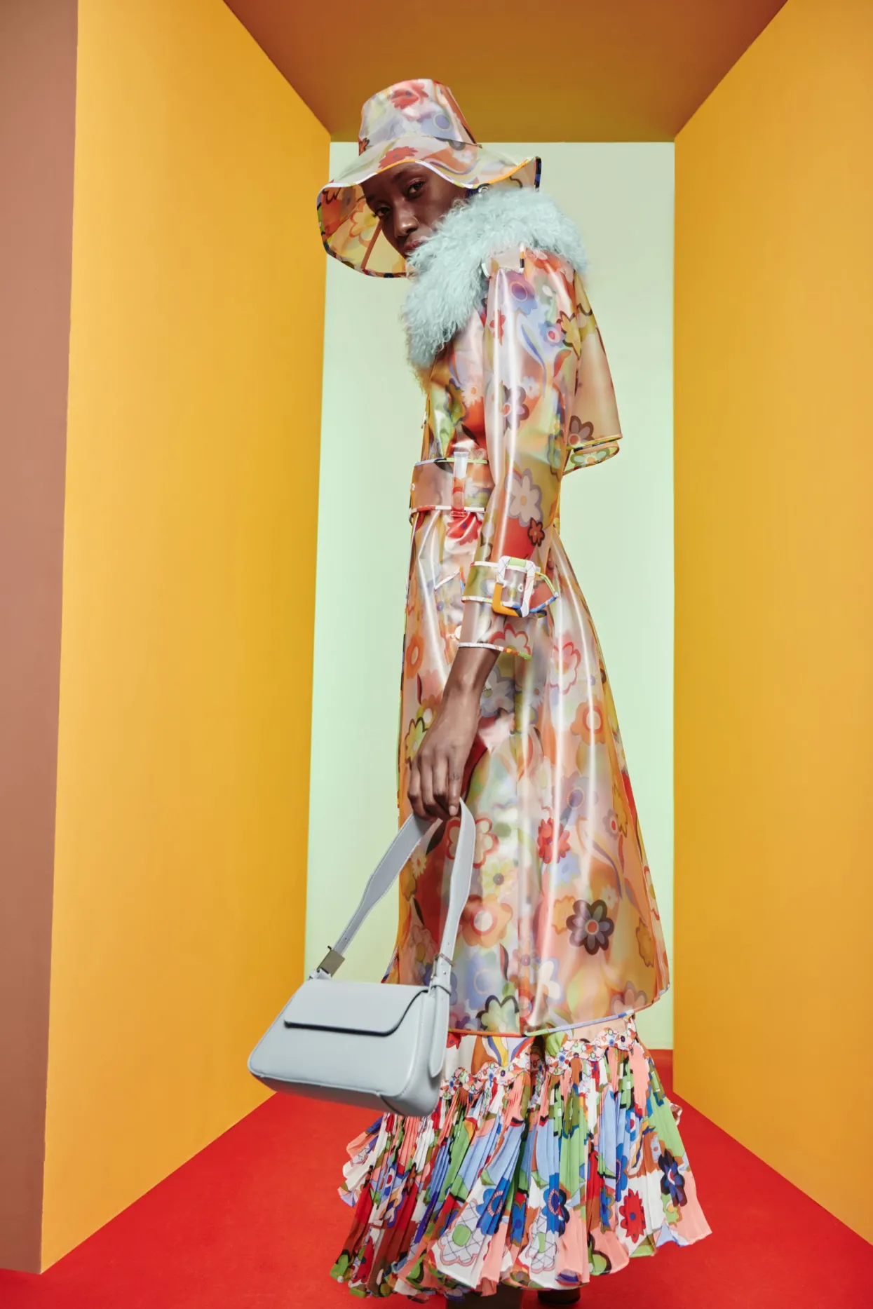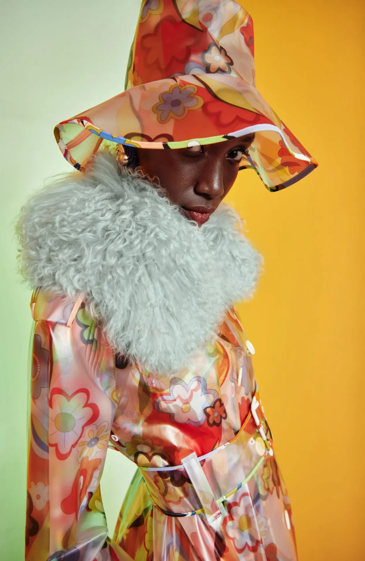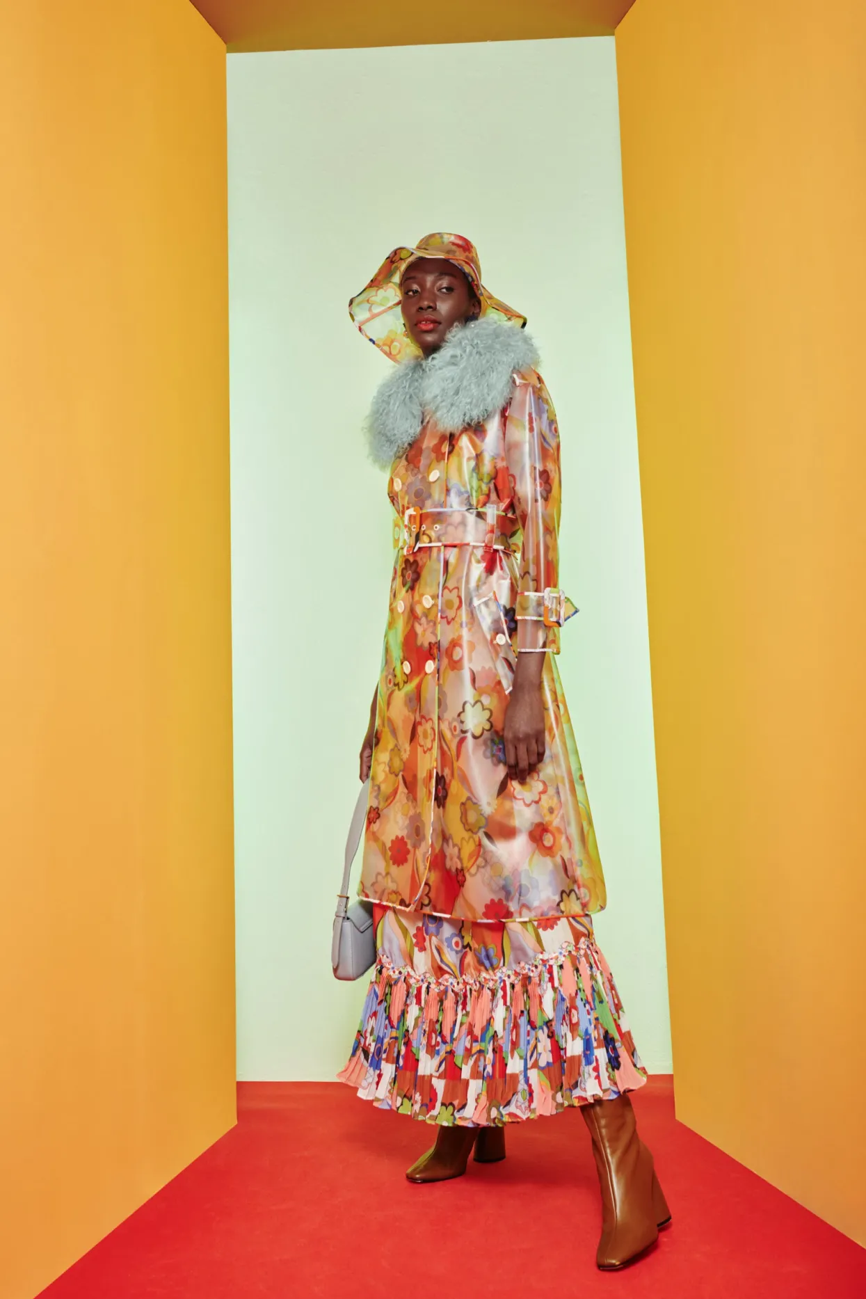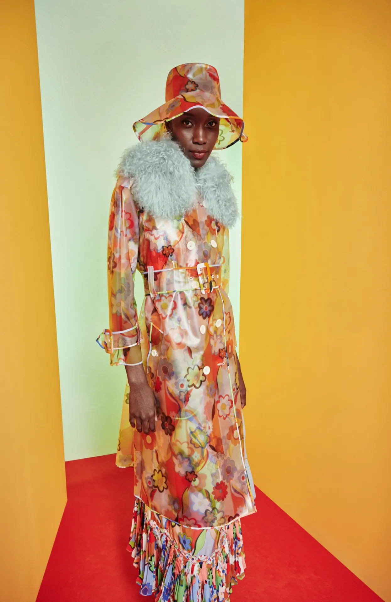 Flower Printed Raincoat With A Large, Matching Buckle Belt, White Buttons And Faux-Fur Collar. A Unique And Fun Take Of A Classic Fall Staple.
