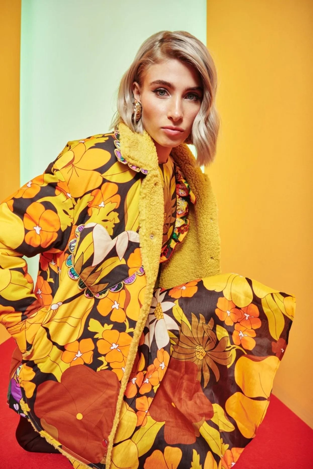 Anorak Like Jacket In Warm Autumnal Tones Like Deep Yellows And Chocolate Browns Coloring A Print Of Blooming Flowers. With Faux-Fur Lining Inside, Peeking Through The Neck Of The Piece, This Jacket Is Perfect For A Rainy Day. The Clasp Button Up Ensures Practicality, And A Fun Detail Is Added Through Heart Shaped Pockets.