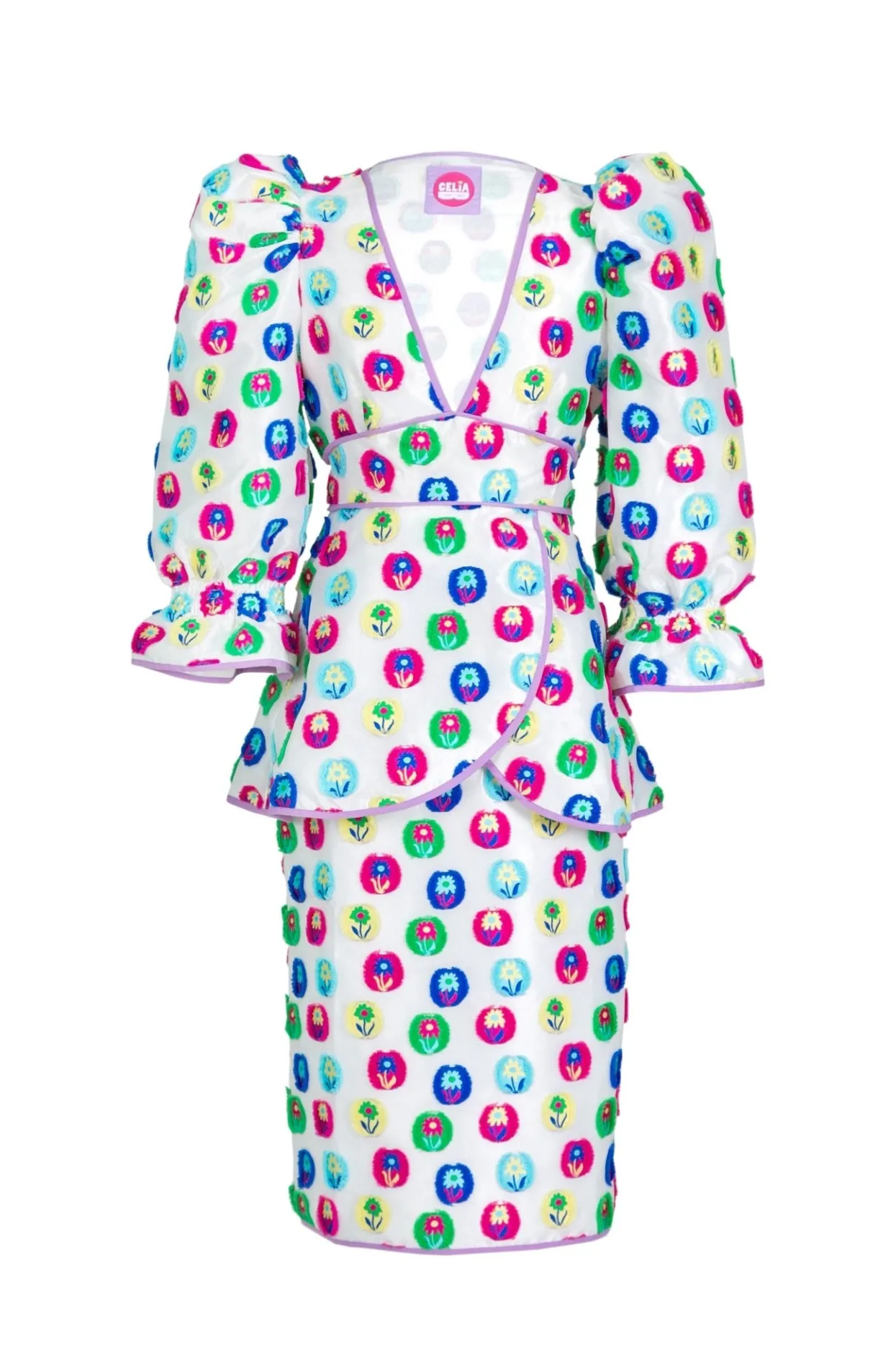 All Over Unique Jacquard Floral Pattern With Exaggerated Puff Sleeve, V Neckline And Pencil Skirt. This Delicate Dress Will Make You Feel Stylish With A Touch Of Sexiness.