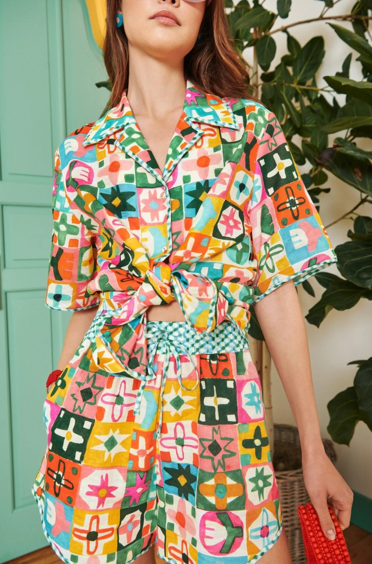 The Matching Outfit Is The Outfit Of The Season. This Patchwork Tile Printed Button Down Top Pairs Effortlessly With The Coordinating Drawstring Shorts.