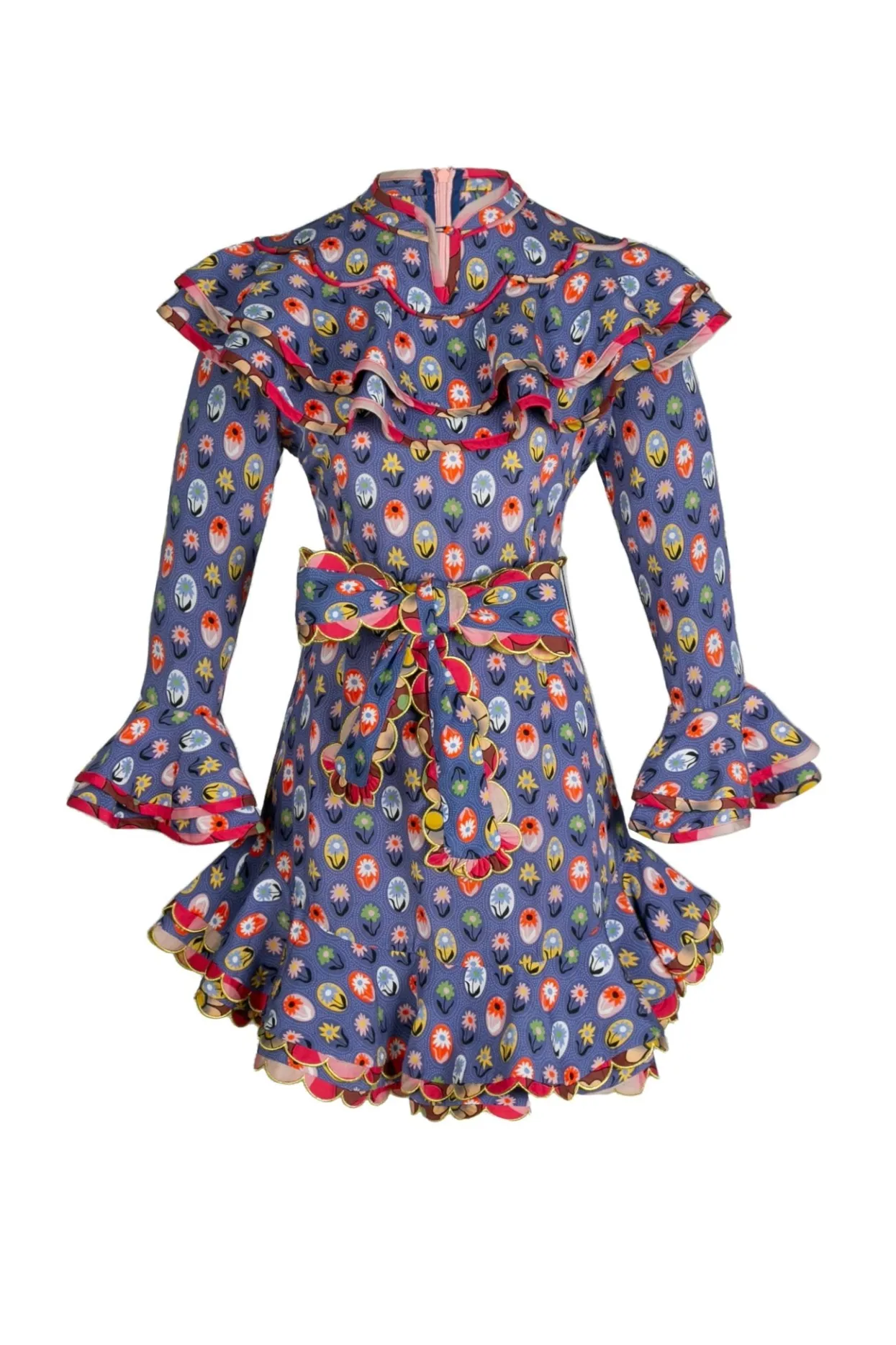 Short, Blue Ruffled Skirt Providing Playful Volume To The Piece. The Slight Ruffled Collar And Cuffs Of The Dress Add A Very Unique Touch, Paired With The Contrasting Pink Print Adorning The Finishing Linings Of The Piece. The Matching Belt Allows For The Dress To Be Further Cinched At The Waist.