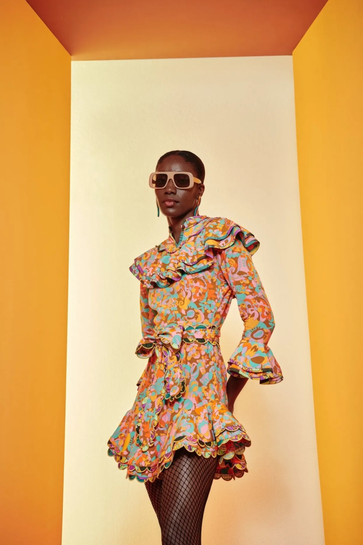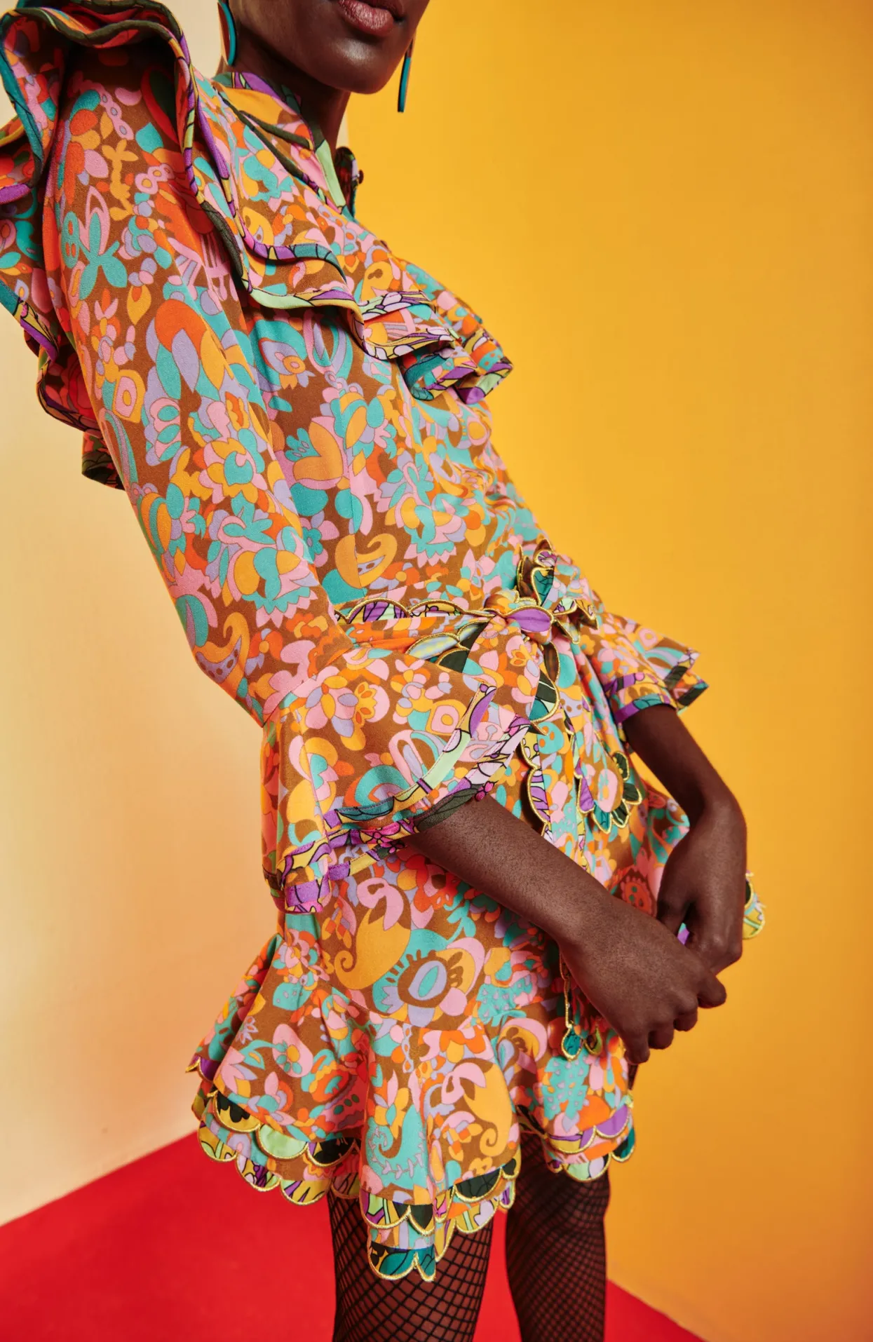 Short, Orange Ruffled Skirt Providing Playful Volume To The Piece. The Slight Ruffled Collar And Cuffs Of The Dress Add A Very Unique Touch, Paired With The Contrasting Print Adorning The Finishing Linings Of The Piece. The Matching Belt Allows For The Dress To Be Further Cinched At The Waist.