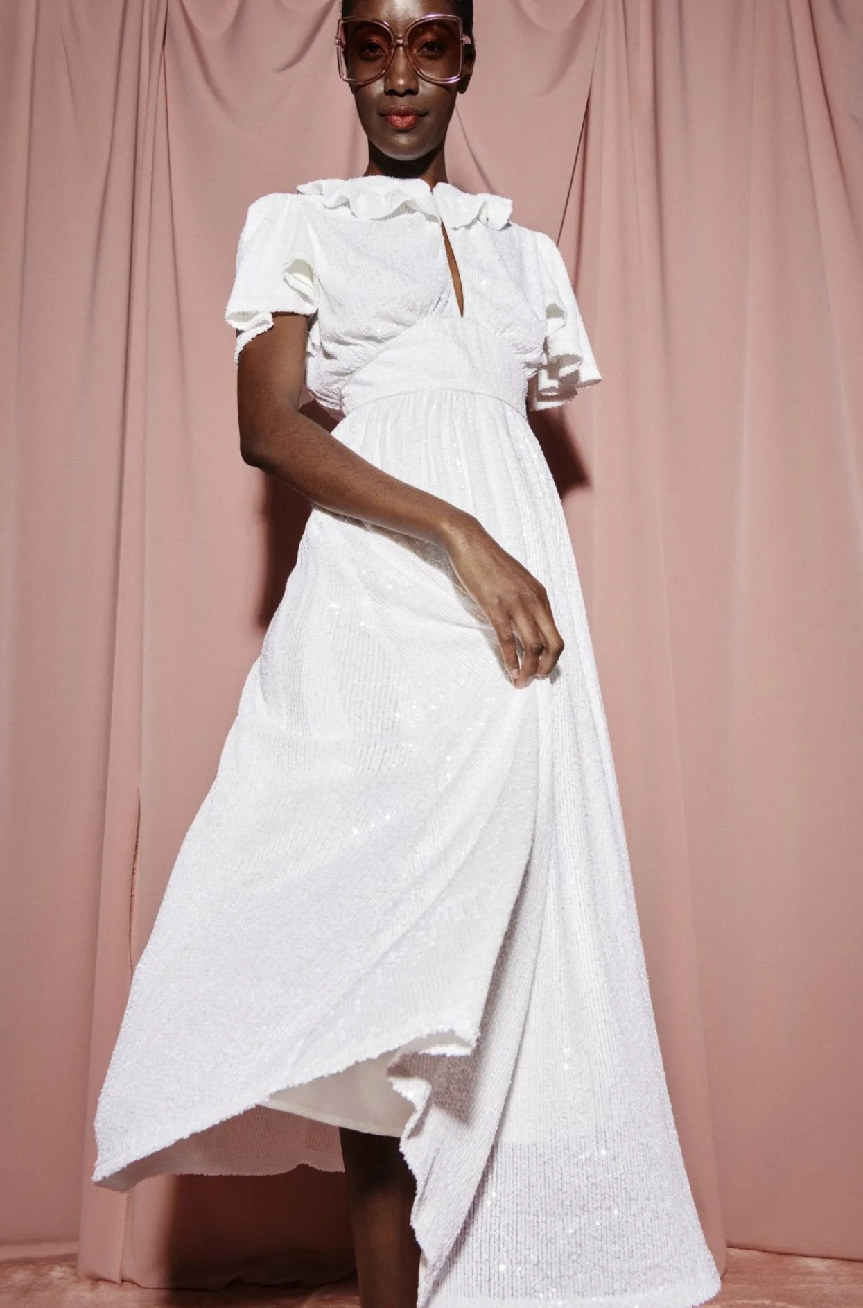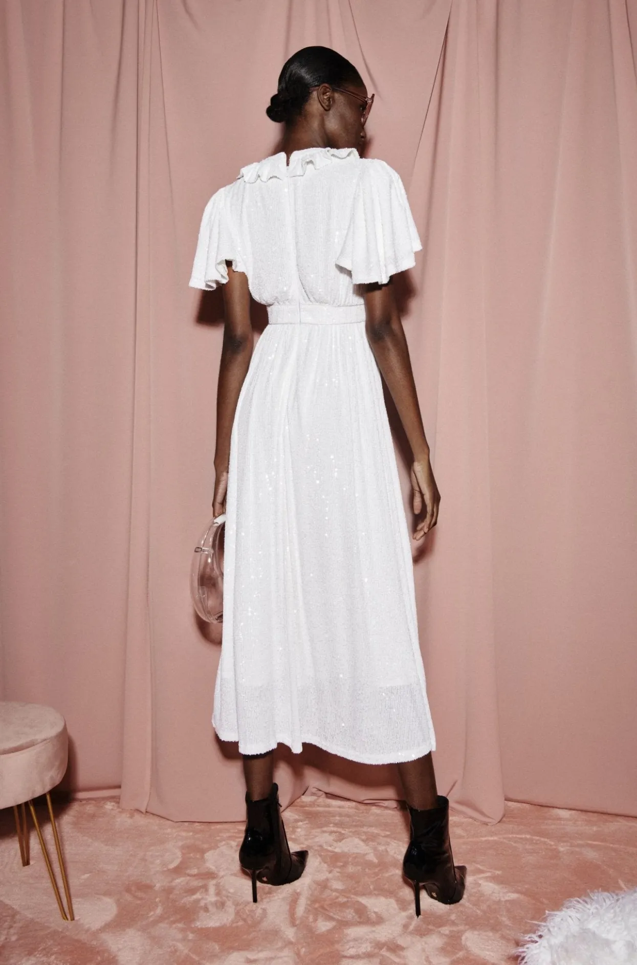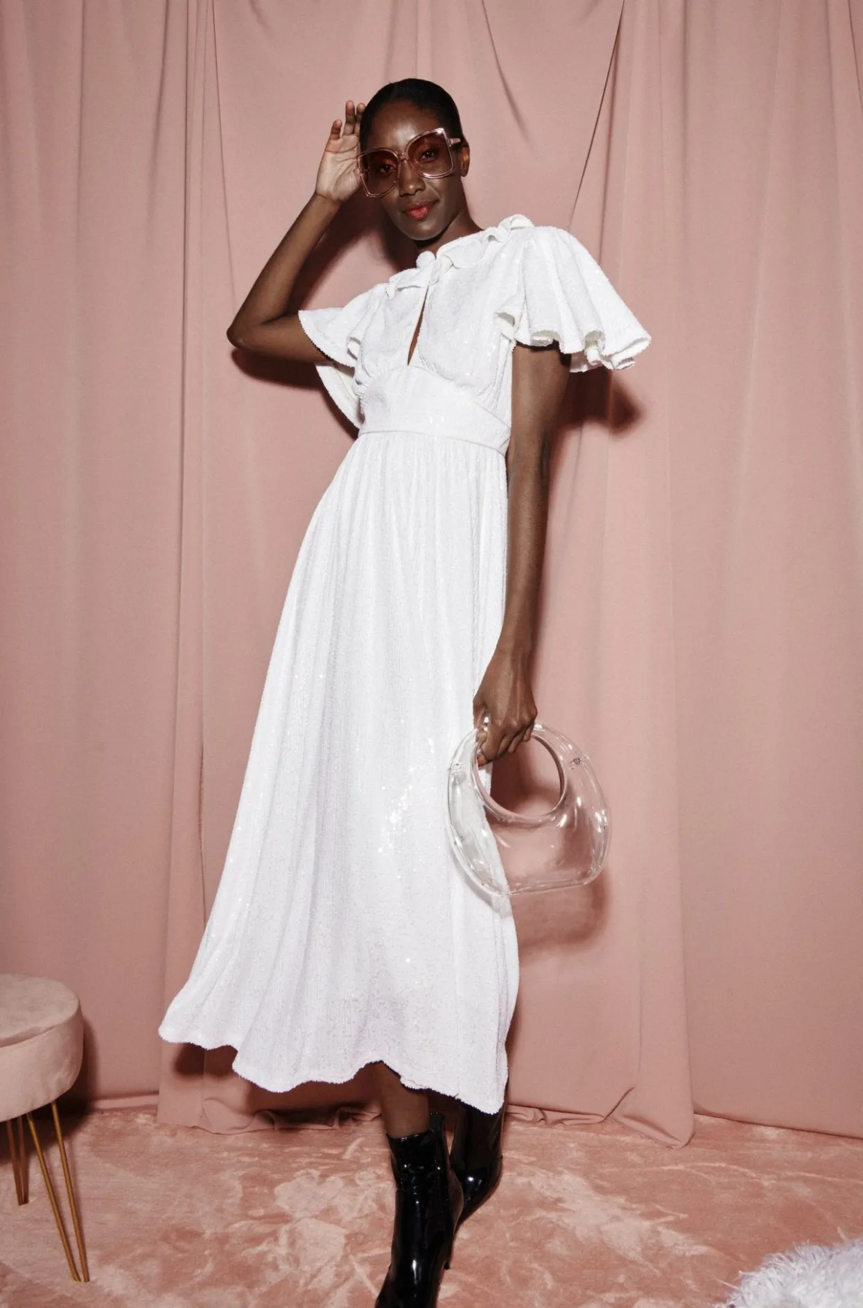 A Sweet, Midi Sequins Dress With Butterfly Sleeves, Cinched Waist And A Flowing Skirt. The Keyhole Detail At The Center Front Will Make You Feel Like The Epitome Of Femininity.