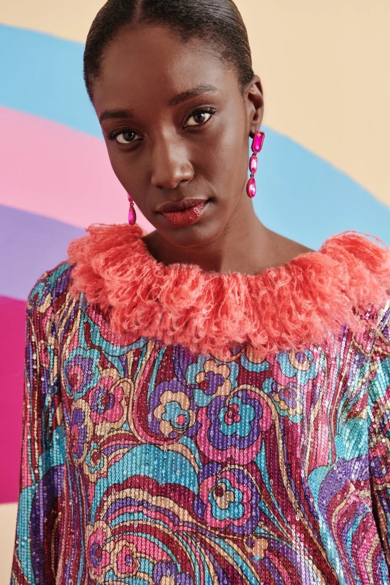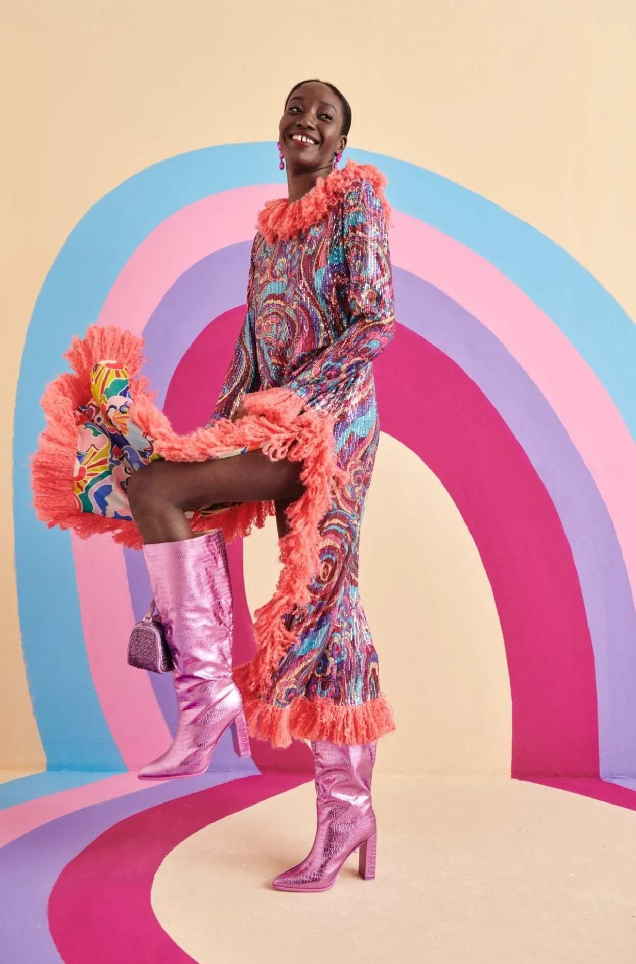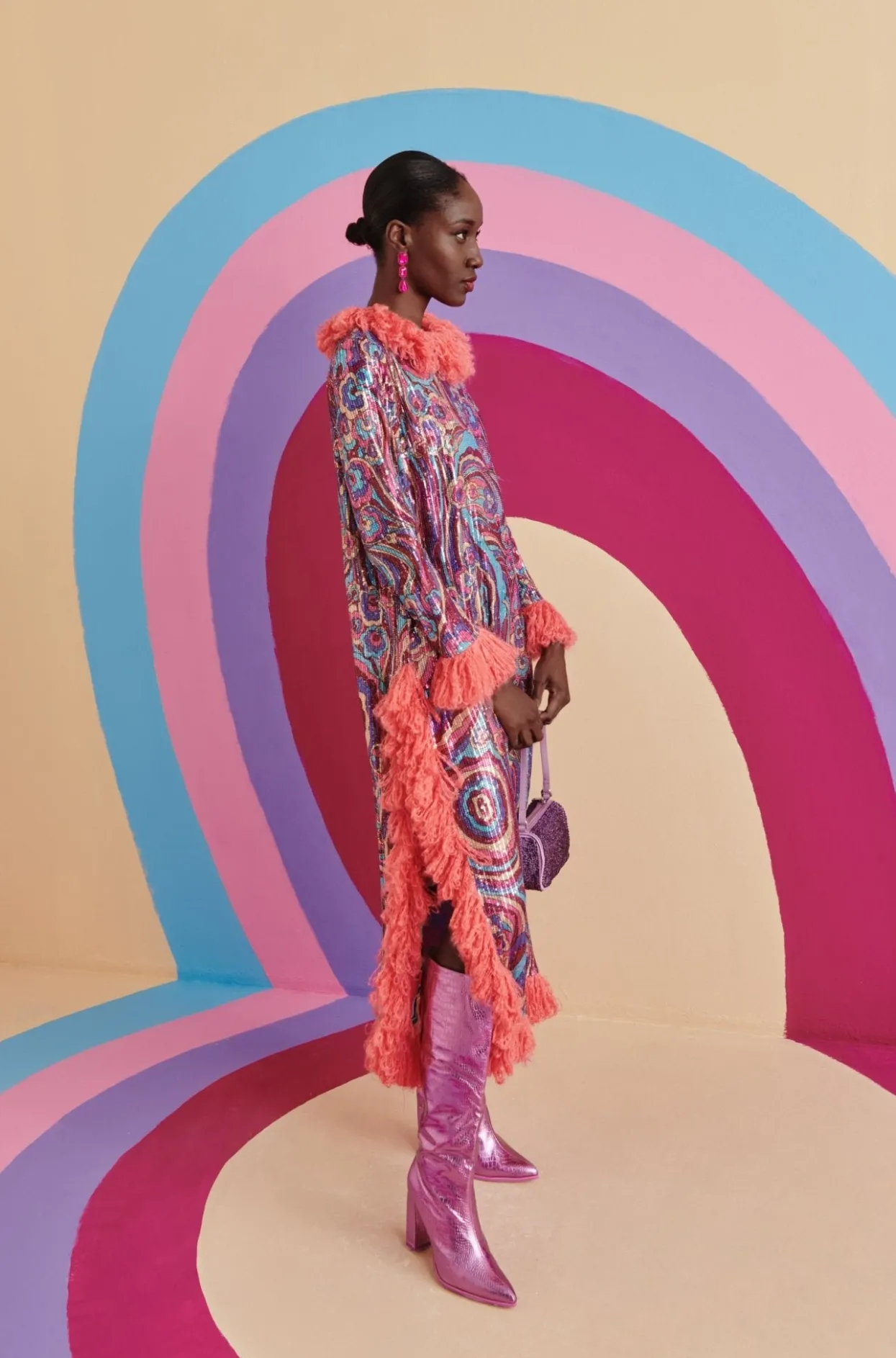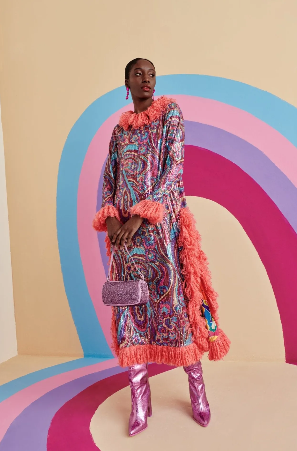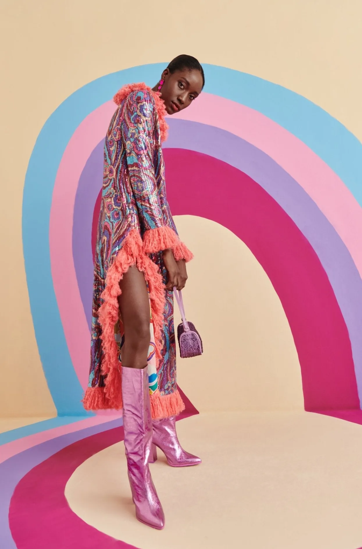 The Silhouette Of Midnight Is A Staple Of This Season’S Collection. With A Fun Print In Pinks, Blues And Purples With The Added Detail Of Pink Feathers Surrounding The Collar, Cuffs And Bottom Of This Dress And Leg Cut-Outs On Both Sides, You Will Be The Center Of All Attention!