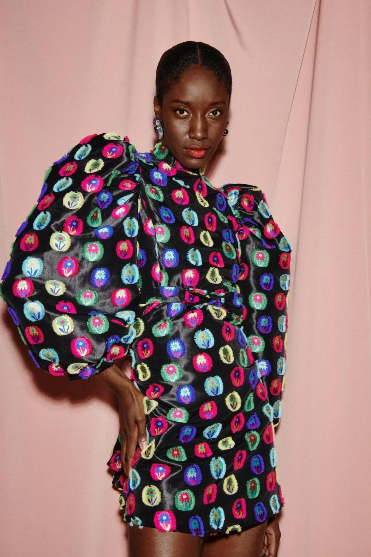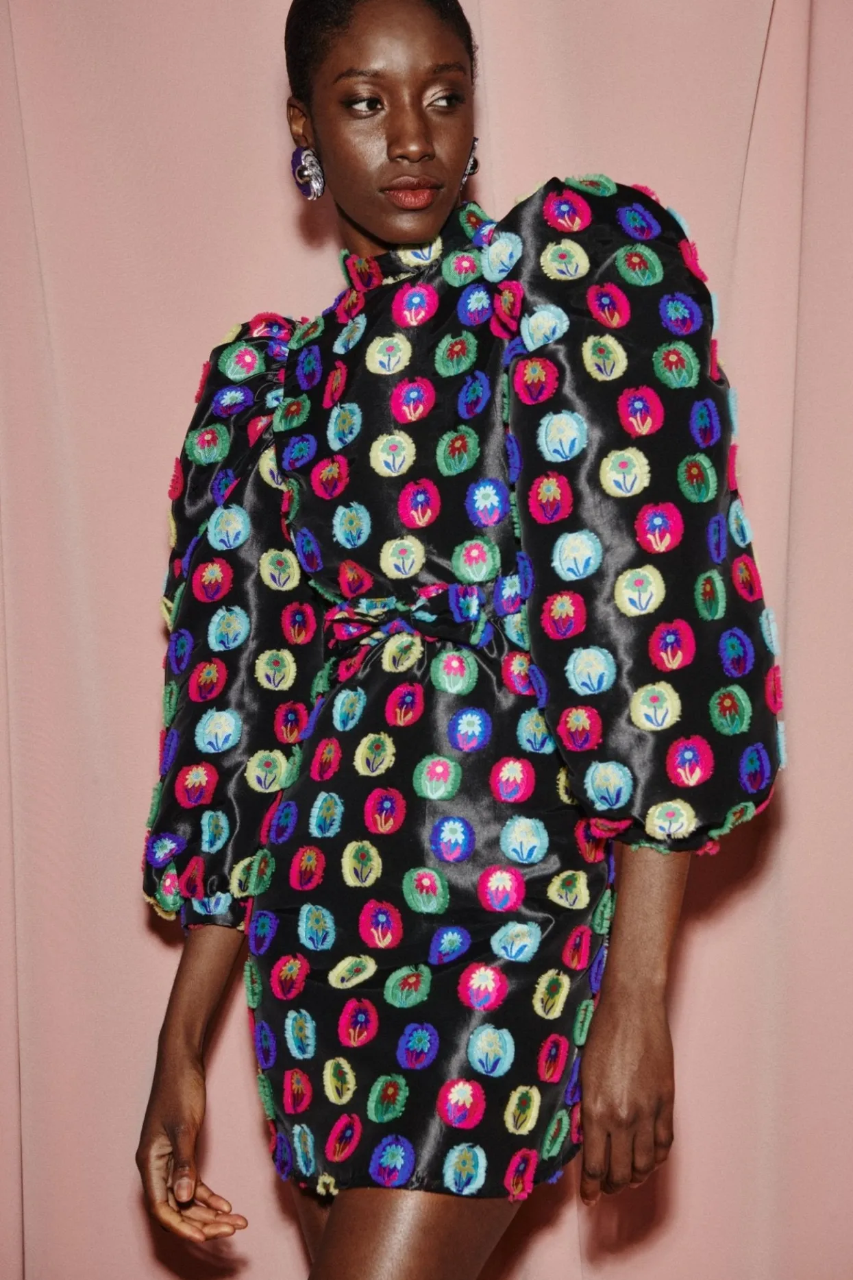 Show Off In This Exaggerated Puff Sleeve Mini Dress With An All Over Unique Jacquard Floral Pattern. With A Bow At The Waist And Ruching On The Skirt, These Incredible Details Will Have All Eyes On You.