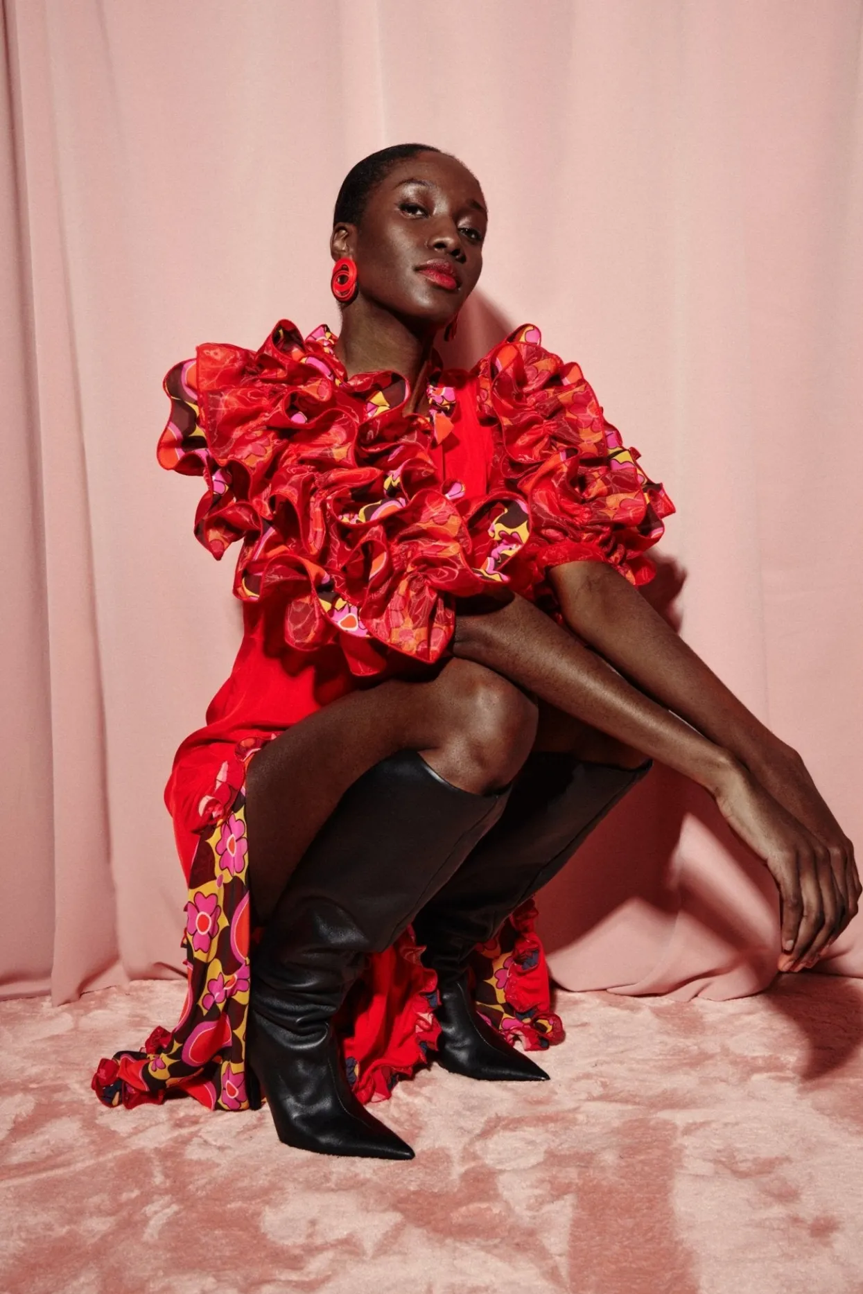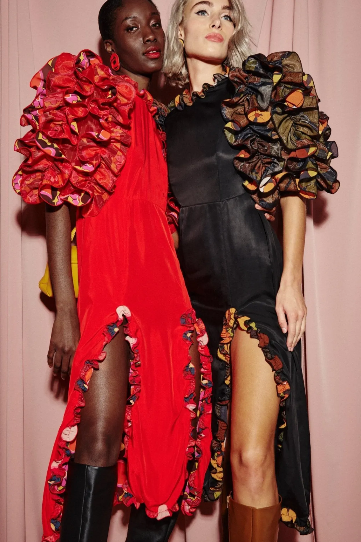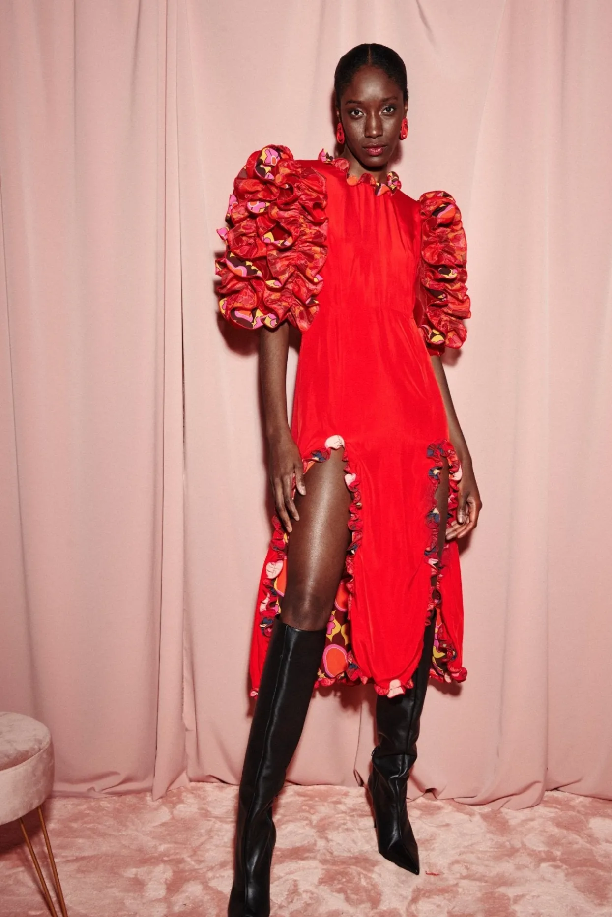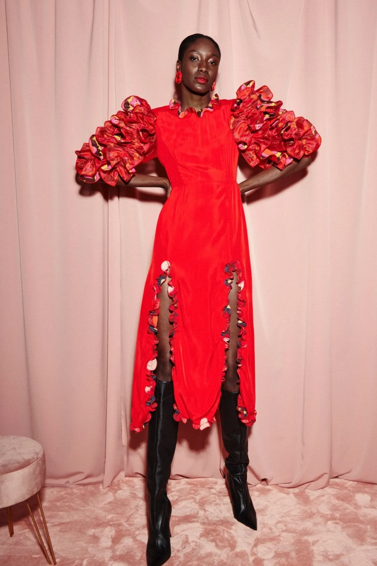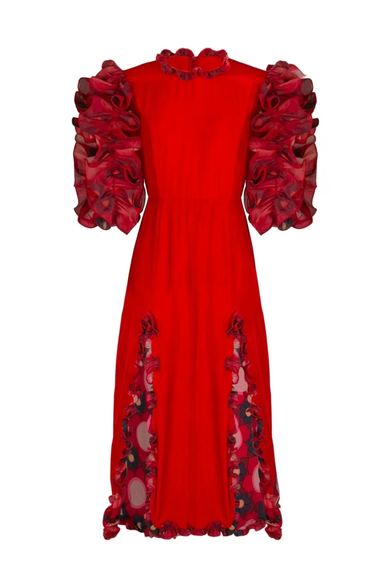 Stand Out In This Midi Dress With Layers Of Printed Ruffles That Create Voluminous Sleeves. A Zip Up Fitted Silhouette With Ruffles Along The Two Front Slits And Hem Will Have All Eyes On You.