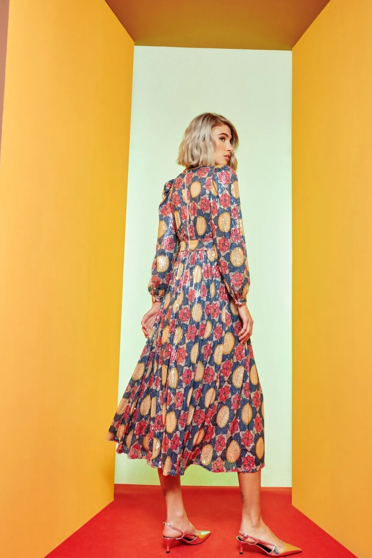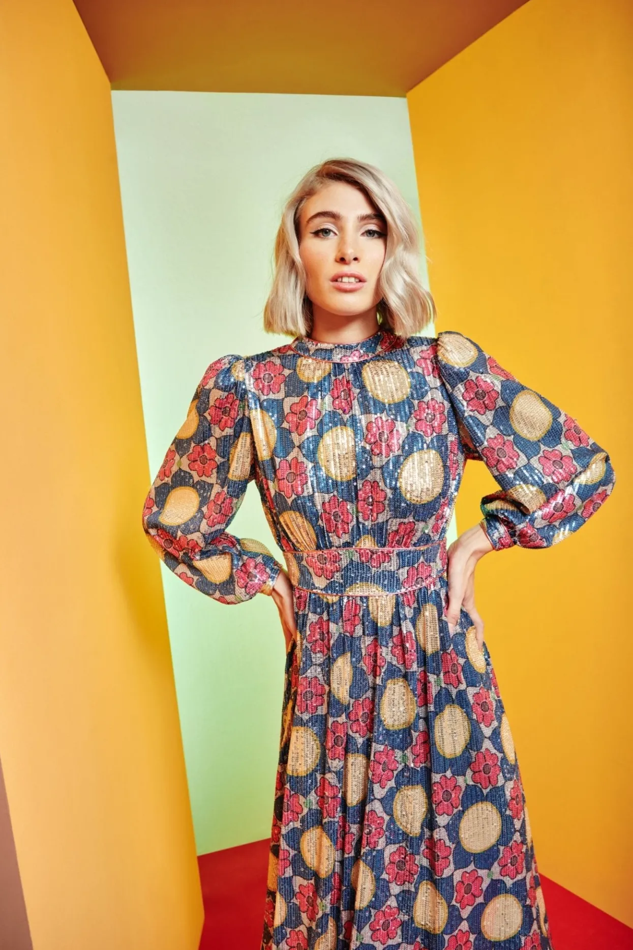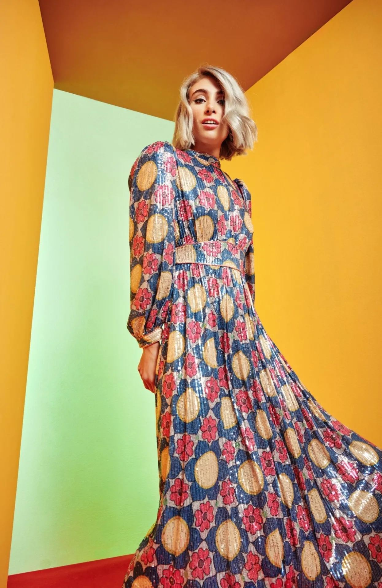 This Long Sequin Dress Is A Classic Silhouette For The Firm, This Season With An Autumnal Flower Print In Blue And Golden Tones. Cinched At The Waist And The Cuffs Of The Sleeves, This Piece Is Perfect For Any Special Event!