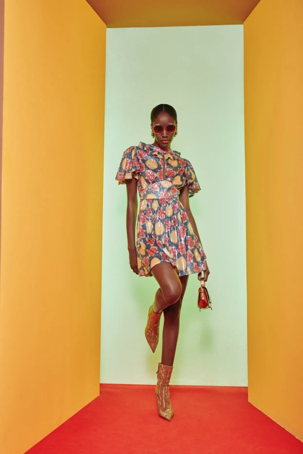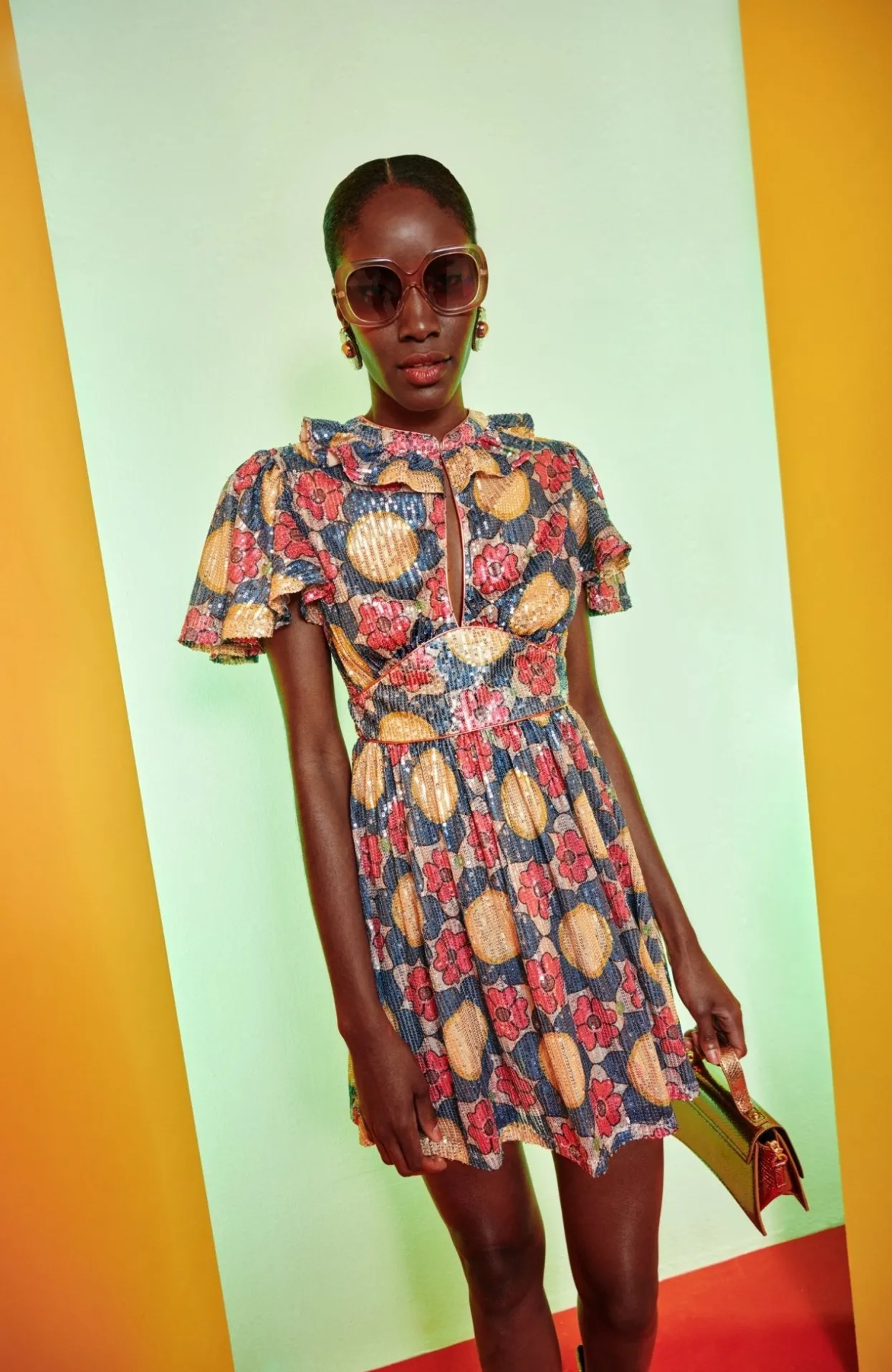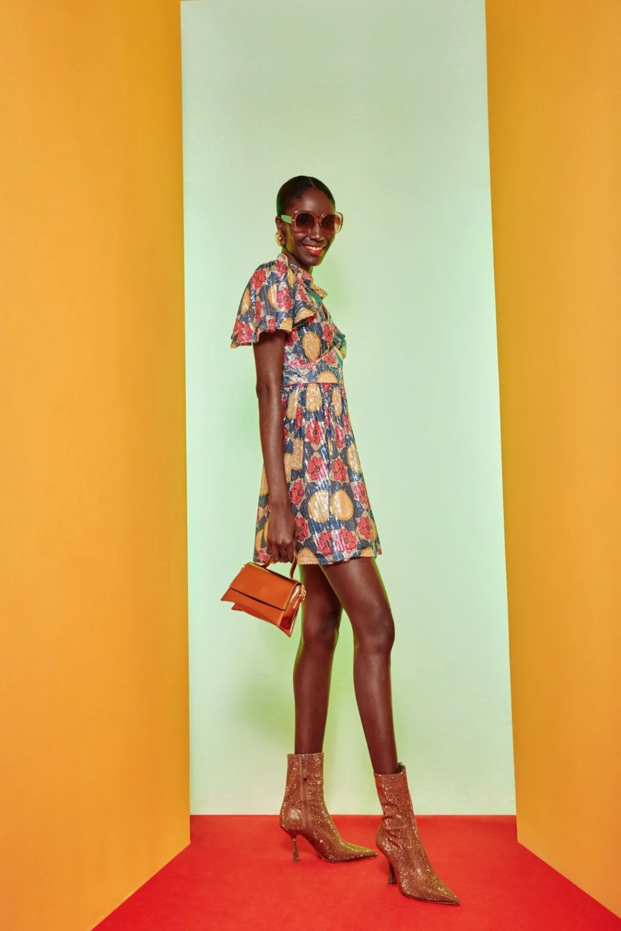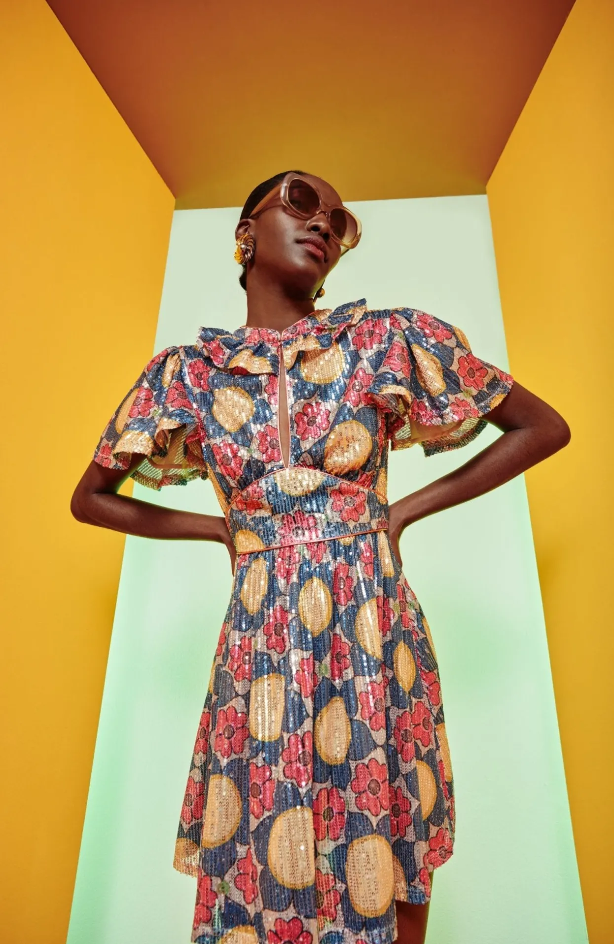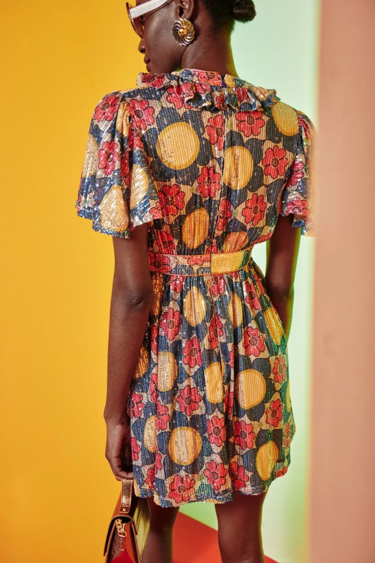 Short Sequin Dress. With A Buttoned High Neck And A Small Chest Cut-Out, You Can Wear This Buttoned Up Or Leave It Open To Create A Deep V-Neck. The Built-In-Belt Cinches The Design At The Waist, Allowing The Skirt To Flow Freely And Comfortably. The Detail Of The Collar And Loose Sleeves, Paired With Its Stunning Flower Print In Autumnal Tones Will Make You Shine At Any Event ! Wanted A Longer Version Of This Piece? Check Out Our Celeste Dresses!