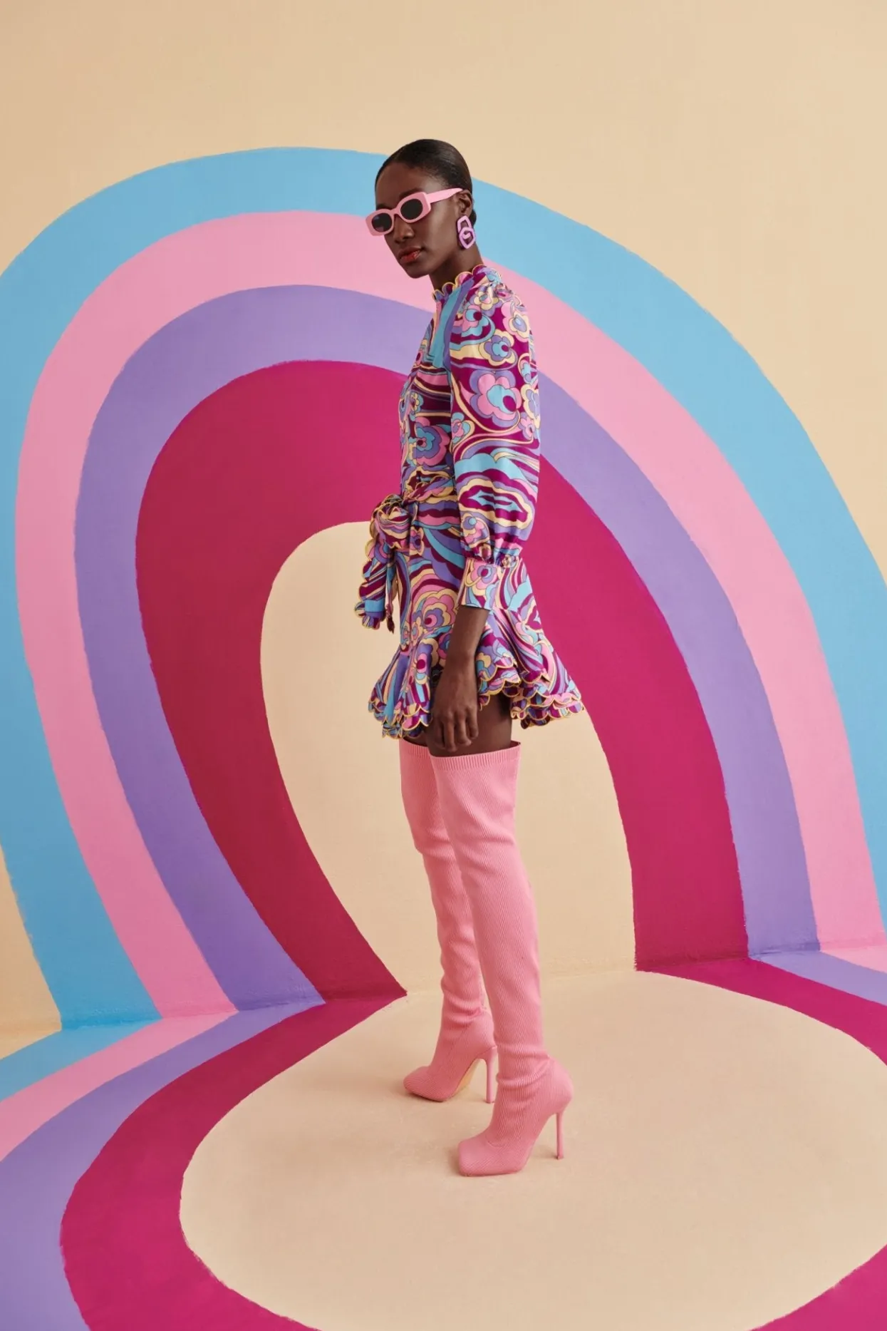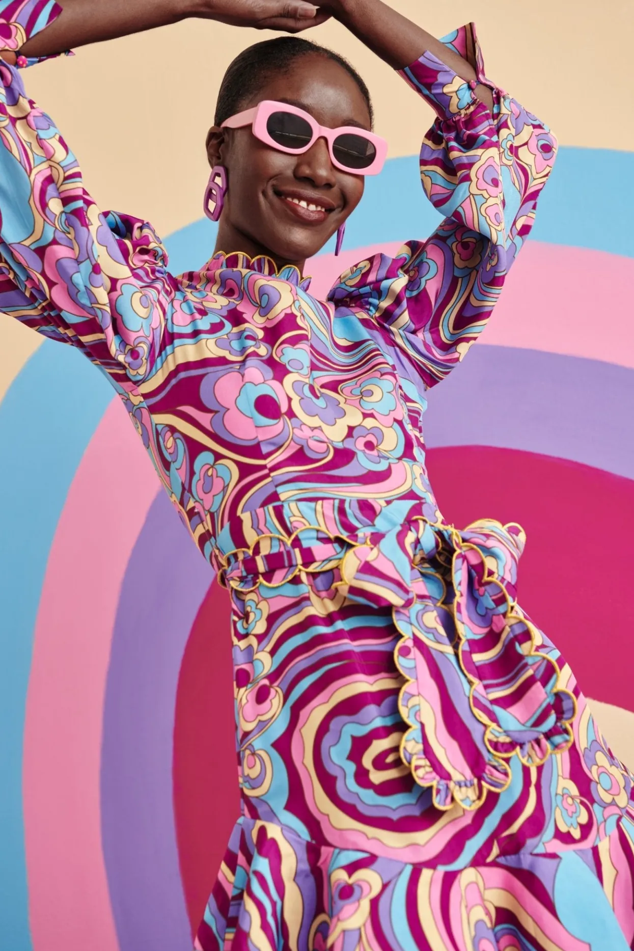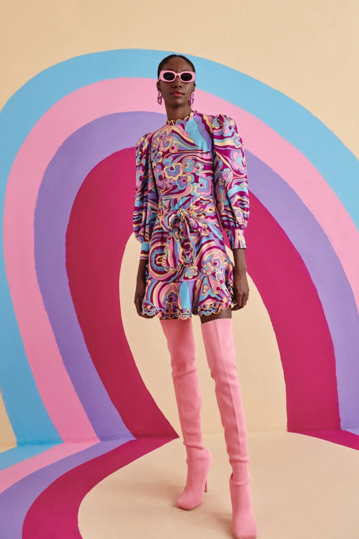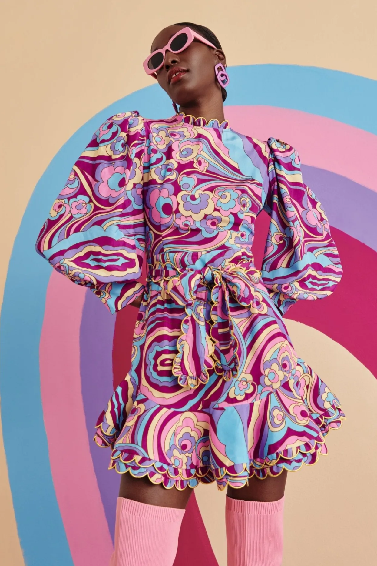 Short, Purple Ruffled Skirt Providing Playful Volume To The Dress. The Leg-Of-Mutton Sleeves Cinched At The Wrist, Similarly To The Waist Of The Dress, Create An Exciting Silhouette.